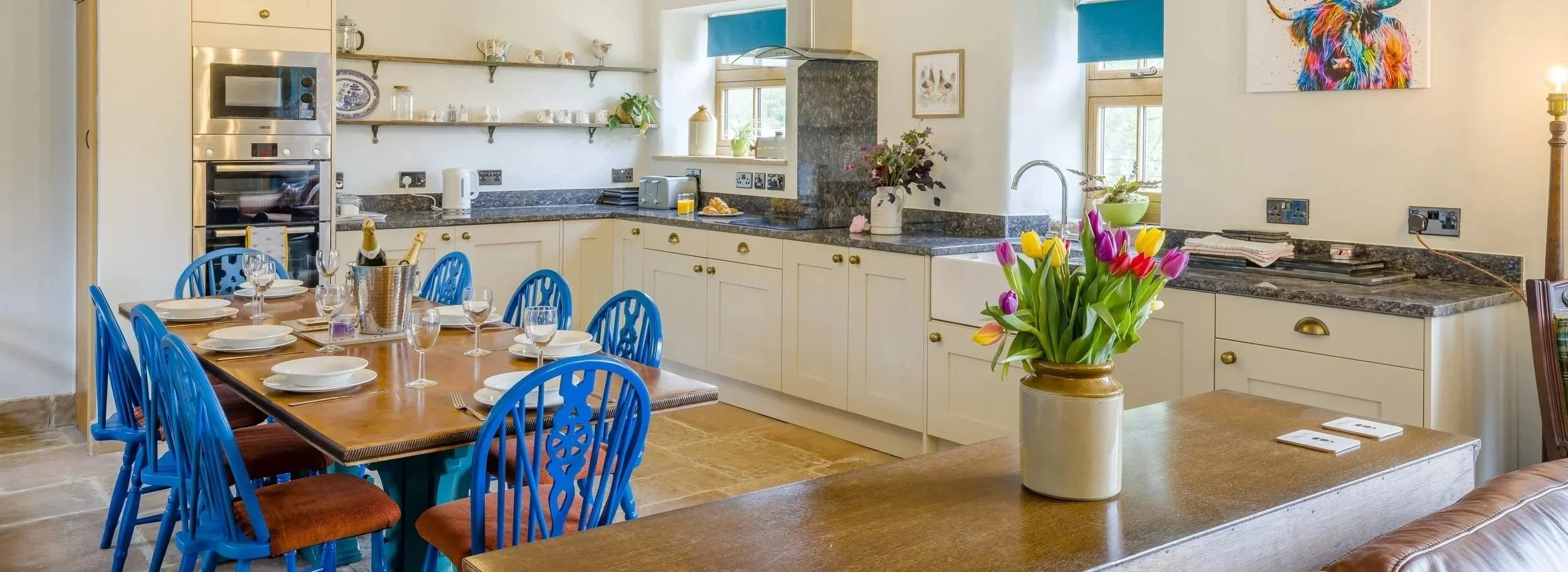 Caldon Barn is our beautifully reimagined barn, where rustic stone and timber blend seamlessly with bold design and thoughtful detail. The open-plan kitchen and dining area is a striking space – brought to life by a rich, vibrant colour palette and bespoke lighting crafted from reconditioned farm machinery. Here, you'll find everything you need for a comfortable stay, including a Smart TV.