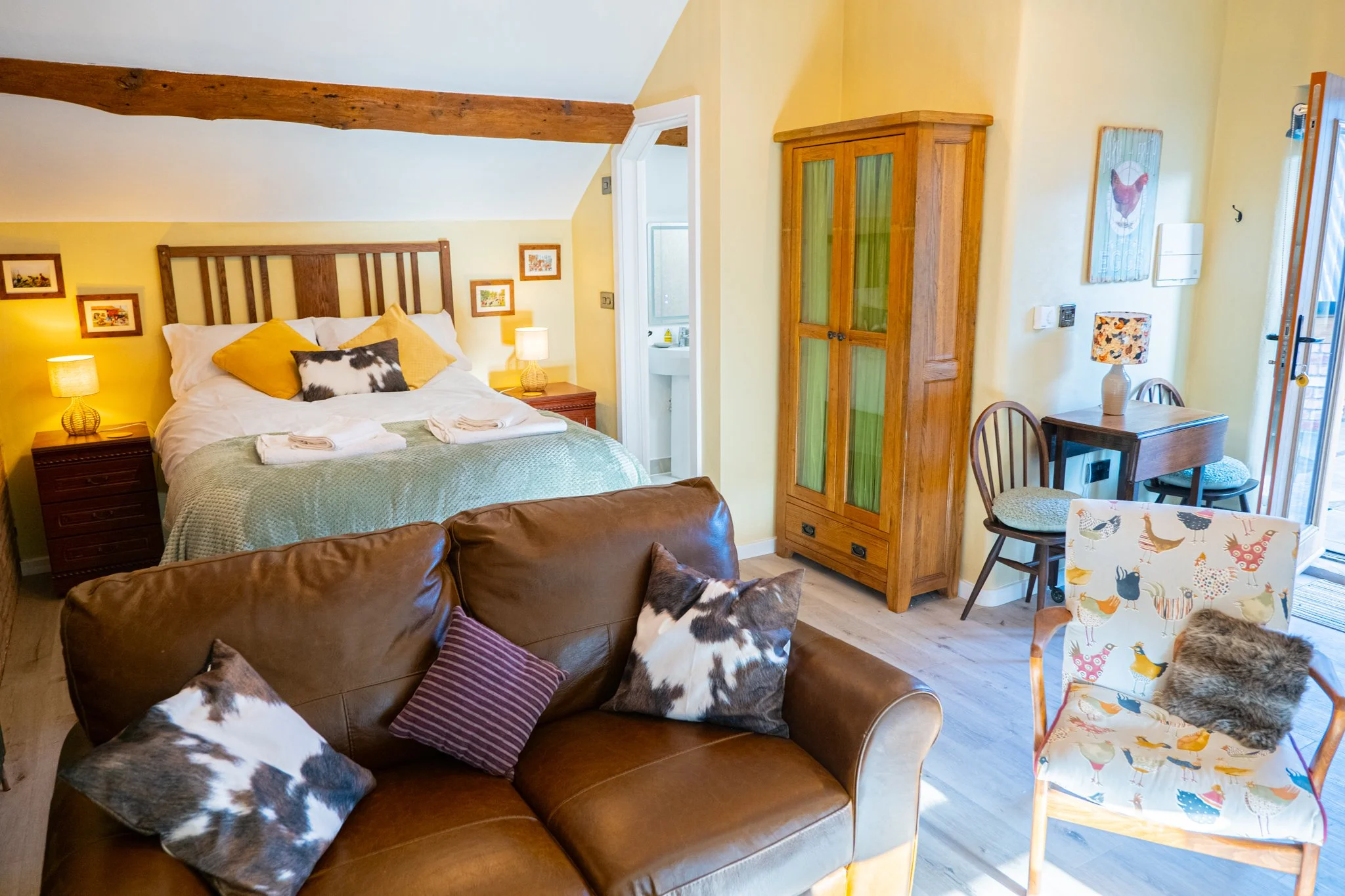 Access to this secluded studio is via a set of steps which lead you onto a tiled patio with glass balustrade and seating. Compact open plan kitchen with comfortable lounge area and Smart TV. Open plan double bed with large en-suite.